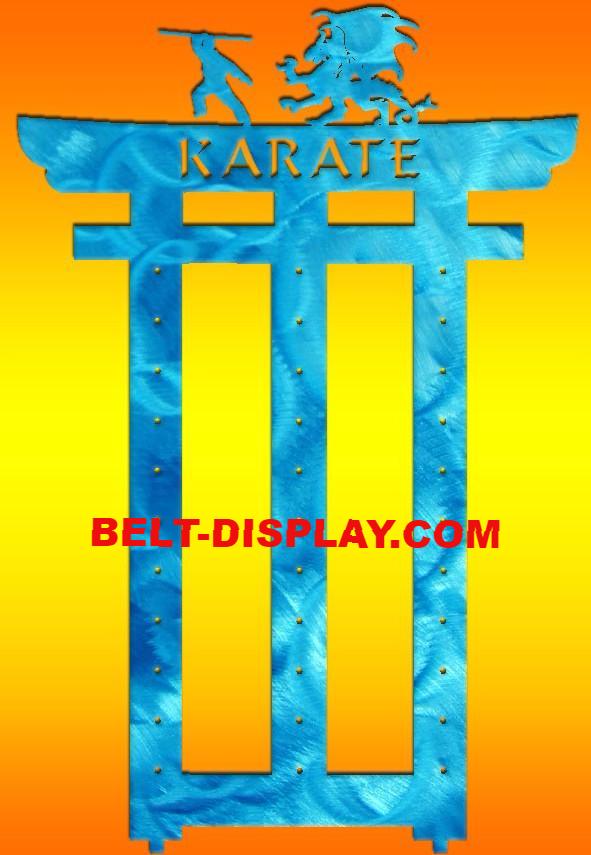 Show off your ranking belts or medals in style.This unique rack is cleverly designed to display ranking belts, and has medal hooks or weapons display hooks. You can choose any type of Martial arts symbols to add to belt display for Karate, Jujitsu, Taekwondo, Judo etc. All of our Martial Arts Belt Displays come with 1'' from wall stand off concealed mounting. Above Pictured Belt Display Rack is shown in hand polished blue anodized finish and precision cut from High Quality Steel. All our products are computer designed, we will email you a preview of your design as per your order request to review and approve before your custom order is made.