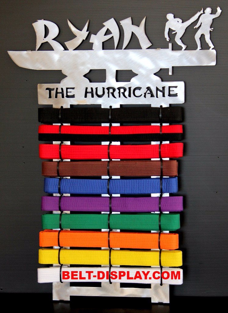This Martial Arts Belt Display Rack is cleverly designed to display from 10 to 17 ranking belts, and has a medal display bar at the bottom of the belt display. All of our Martial Arts Belt Displays come with 1'' from wall stand off concealed mounting. Above Pictured Belt Display Rack is shown in hand polished steel finish and precision cut from High Quality Steel. All our products are computer designed, we will email you a preview of your design as per your order request to review and approve before your custom order is made.