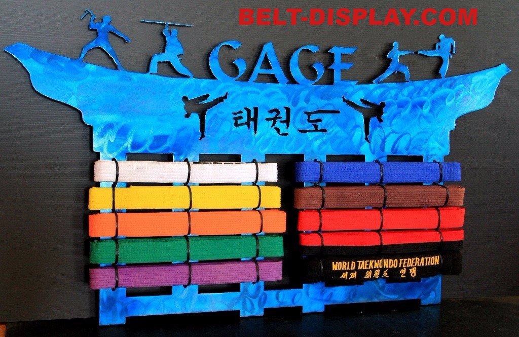 With our Belt Displays you can add Martial Arts Symbols of your choice for Karate, Taekwondo, Jujitsu, Tang Soo Do, Judo or your Mixed Martial Arts Logos to any of our Displays. It can be ordered with medal hooks or weapons display hooks. All of our Martial Arts Belt Displays come with 1'' from wall stand off concealed mounting. Above Pictured Martial Arts Belt Display is shown in hand polished anodized blue finish and precision cut from High Quality Steel. All our products are computer designed.