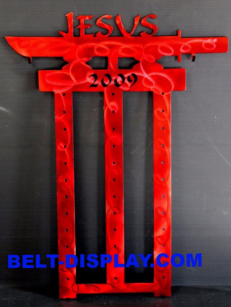 Above Pictured Karate Belt Display is a 11 belt holder shown in hand polished anodized red finish and precision cut from High Quality Steel. All our products are computer designed.