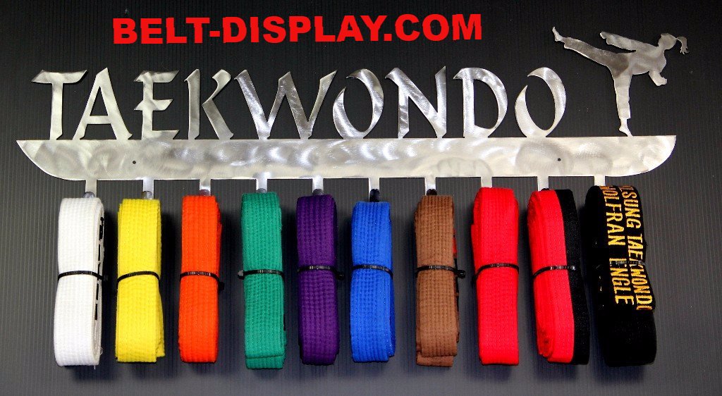 Personalized Belt Holder with the word taekwondo. You can add your choice of Martial Arts Symbols beneath the name for Karate, Jujitsu, Taekwondo, Tang Soo Do, etc. This unique rack is designed to display from 6 to 12 ranking belts, and can be personalized with name. All of our Martial Arts Belt Displays come with 1'' from wall stand off concealed mounting. Above Pictured Belt Display Rack is shown in a brushed steel finish and precision cut from High Quality Steel. All our products are computer designed. All our designs are available in various colors and sizes.