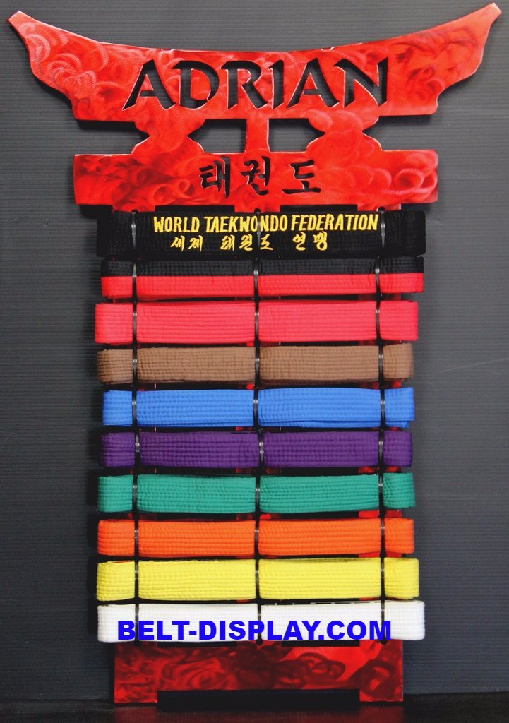 Traditional Martial Arts Taekwondo Belt Holder using old world Pagoda design. You can add your choice of Martial Arts Symbols for Karate, Taekwondo or Jujitsuto to all our Belt Display Racks.This Belt Display Rack is designed to be personalized and display from 10 to17 ranking belts, and can be ordered with medal hooks or weapons display hooks. All of our Martial Arts Belt Displays come with 1'' from wall stand off concealed mounting. Above Belt Display Rack is shown in hand polished anodizedl red finish and precision cut from High Quality Steel. All our products are computer designed, we will email you a preview of your design as per your order request to review and approve before your custom order is made.